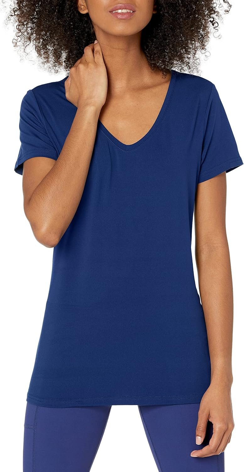 The Amazon Essentials Women's Active Quick Dry Tech Stretch Short-Sleeve V-Neck T-Shirt, available in a value pack of two and plus sizes, is perfect for staying comfortable during workouts or casual outings. Made from breathable, quick-dry, and stretchy fabric, these tees keep you cool and move with you all day long. Trust the Amazon Essentials brand for reliable, high-quality activewear that combines style, durability, and great value.