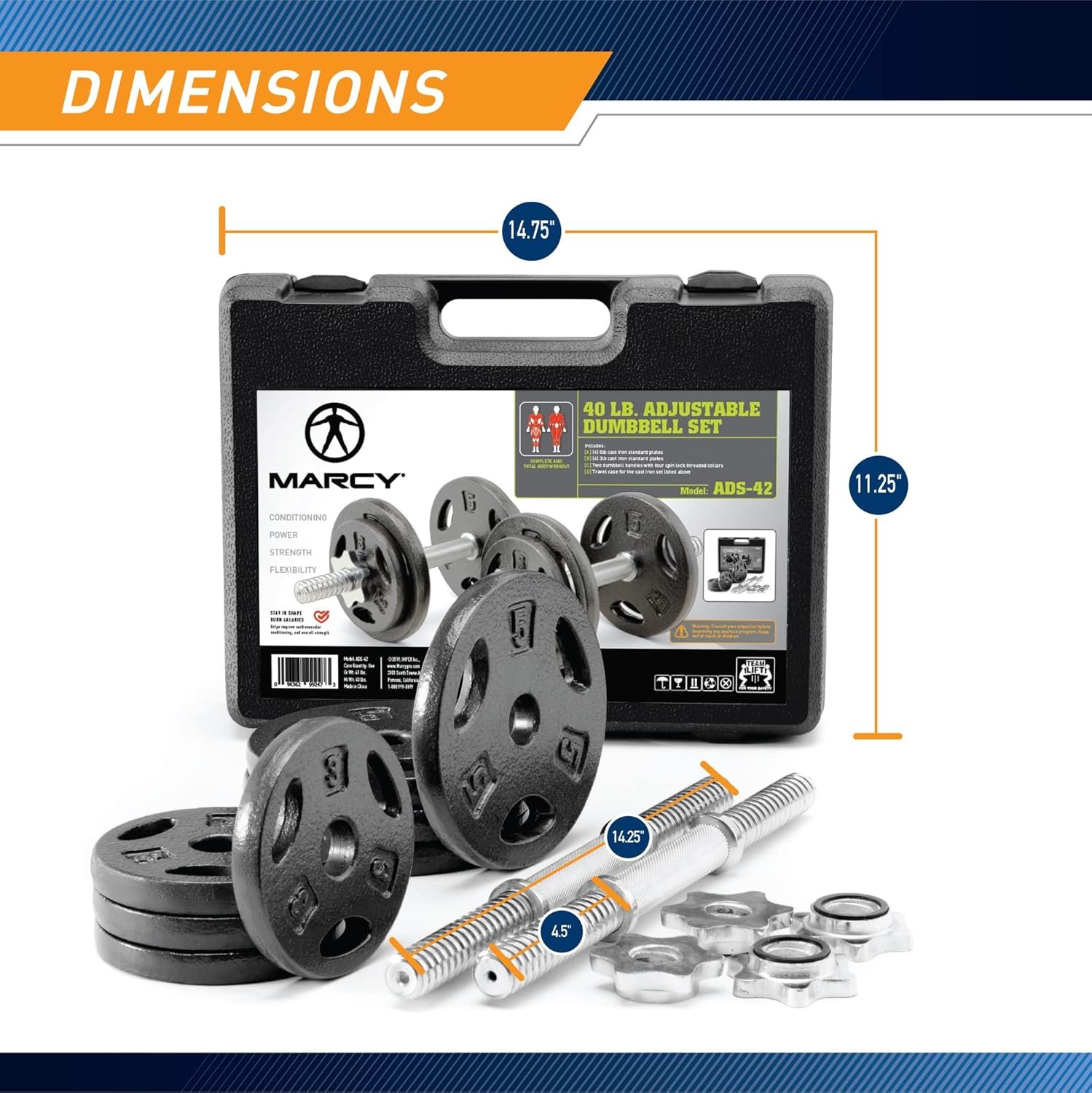 Upgrade your home workouts with the Marcy 40 lbs Adjustable Dumbbell Set, designed for efficient strength training and muscle building. Featuring durable cast iron plates, a knurled steel bar for enhanced grip, and secure spin lock collars, this set ensures safe and stable lifting. The customizable weight options and included sturdy carrying case make it perfect for fitness enthusiasts of all levels. Trust the MARCY brand for reliable, convenient equipment tailored for your home gym.