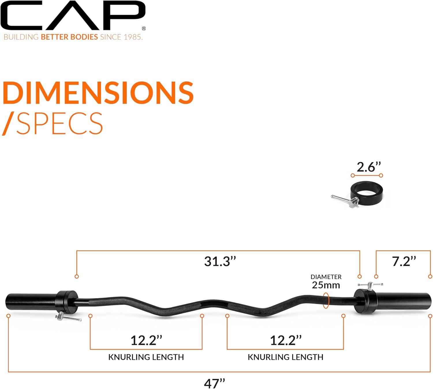 The CAP Barbell 47-Inch Olympic EZ Curl Bar is expertly constructed from cold-drawn solid steel with a durable black powder coat, ensuring strength and longevity for your workout routine. Designed to reduce wrist and forearm strain, this curl bar features a unique angled shaft and secure diamond knurled grip, making it perfect for arm-focused exercises like curls and triceps extensions. Compatible with all 2-inch Olympic plates and including T-screw collars, it’s an ideal addition to any home or garage gym. Trust CAP Barbell for reliable, high-quality fitness equipment backed by over 30 years of industry expertise.